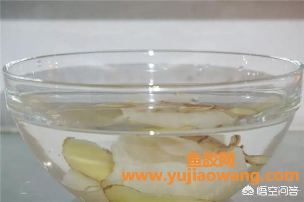 3、蒸好后的花胶立即置于水中浸泡,放上几片姜片(如果花胶呈卷缩状,可借助冰块压平,帮助定型)。