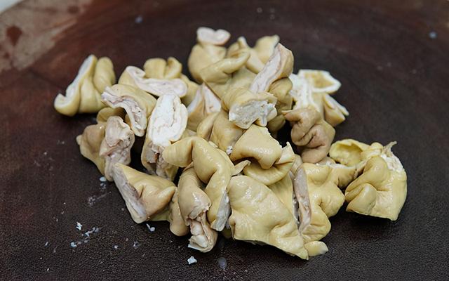 第五步:锅内留少许底油,下入葱、姜、蒜片炒出香味;接着加入少许花雕酒和清水,并调味多一点的蚝油和少许盐、鸡精、白糖、胡椒粉、生抽酱油、老抽酱油;大火烧开后下入肥肠翻炒均匀;然后往锅中加入少许水淀粉勾芡收汁,再次大火翻炒均匀;最后往锅中淋入少许香油并稍加翻炒即可出锅装盘。