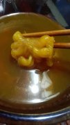 - 隔天将已经泡软的花胶捞出来,洗净上面的油脂(黄黄的油油的就是油脂)、残留的血污之类的,可以用刀子轻轻刮去,实在有不好刮掉的可以稍微切掉一部分(如果不充分处理干净就会有腥味);