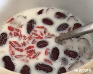 将红枣去核(带核比较上火),两同飞水的鱼胶、牛奶一同倒入炖锅;开启精炖功能