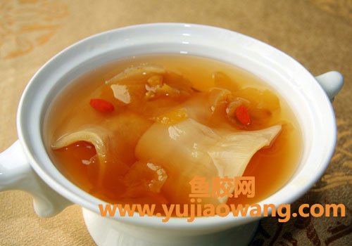 鱼胶 15 克红枣(去核) 4-5 个,加水适量,炖大概 2-3 个小时,放入冰糖即可食用。本汤适用于补气血、养容颜,对于气血不足,失于调养,症见神疲体倦,肌肤不泽,面部皱纹者尤佳。(也可加莲子、百合、枸杞、洋参、桂圆肉等同炖)