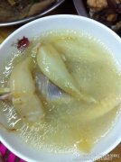 材料:花胶50克、排骨250克、淮山4片、姜4片、大葱一根,另外可备党参、枸杞之类的温和汤料。