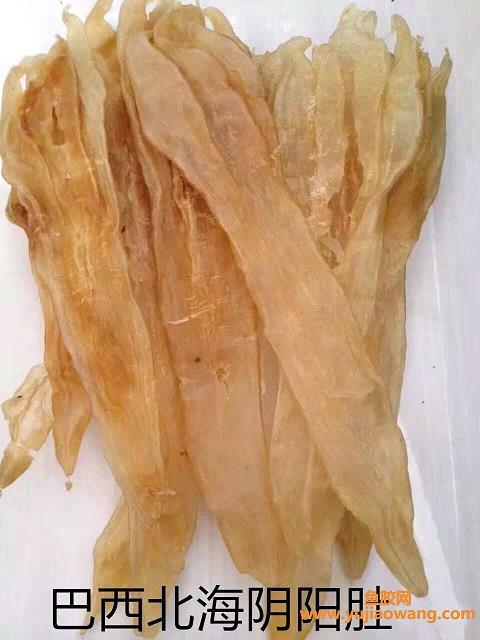 阴阳肚是苏里南秋鱼的鱼泡泡。阴阳肚的腥味较重,胶身有两条比较明显的透明纹路,两个耳朵从胶体中上一直延伸到头部,阴阳肚的产量大,因此价格也是比较低的。